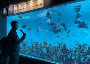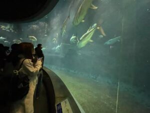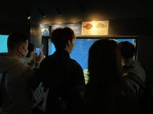 中心にある大きい水槽は圧巻で、多くの学生がその水槽の前で写真を撮ったり、魚の動きを見て真剣に話し合ったりしていました。